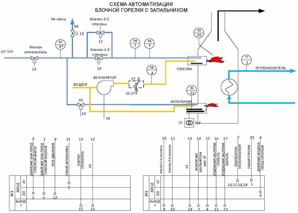 - дискретное регулирование подачи воздуха в соответствии с подачей топлива (большое, малое горение и режим ожидания);