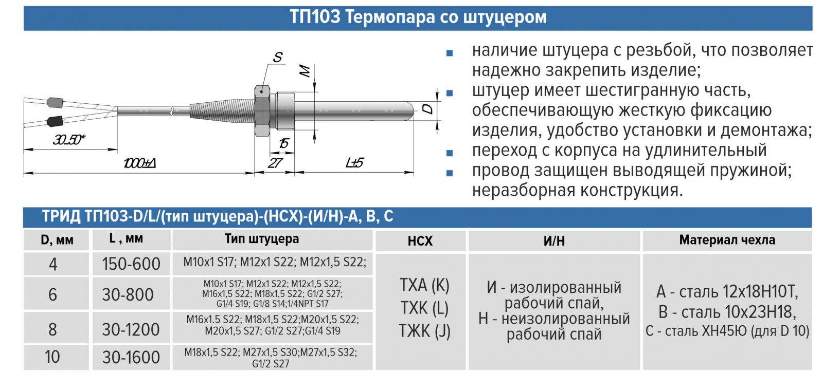 Серия термопар с удлинительным проводом является наиболее востребованной благодаря простоте конструктивного исполнения и широкому диапазону применения. Также характеризуется разнообразием конструкций и вариантов изготовления. В данной серии термопарных преобразователей ТРИД с кабельным выводом представлены пять моделей различного конструктивного исполнения.