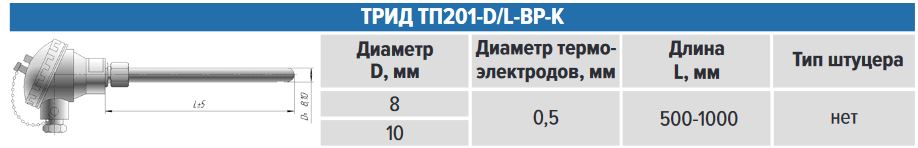 Серия высокотемпературных термопар. Их отличительная особенность в том, что защитный чехол выполнен из высококачественной газоплотной керамики марки С799, способной выдерживать высокие рабочие температуры. Модельный ряд термопар серии ТРИД-К представлен в трех вариантах конструктивных исполнений с варьирующимися габаритными размерами. Опционально термопары могут быть укомплектованы термопарными разъемами (штекерами).
